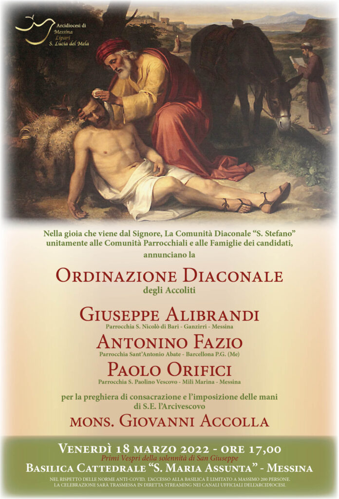 La Chiesa di Messina-Lipari-Santa Lucia del Mela annuncia l’ordinazione diaconale di tre nuovi Diaconi permanenti, Giuseppe Alibrandi della Comunità parrocchiale S. Nicolò di Bari in Ganzirri-Messina, Antonino Fazio della Comunità parrocchiale S. Antonio Abate in Barcellona P.G. (Me) e Paolo Orifici della Comunità parrocchiale S. Paolino Vescovo in Mili Marina-Messina. La celebrazione eucaristica e il rito di ordinazione diaconale saranno presieduti da Sua Eccellenza l’Arcivescovo Mons. Giovanni Accolla venerdì 18 marzo 2022, alle ore 17.00, presso la Basilica Cattedrale di Messina.