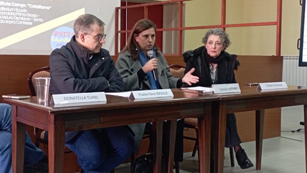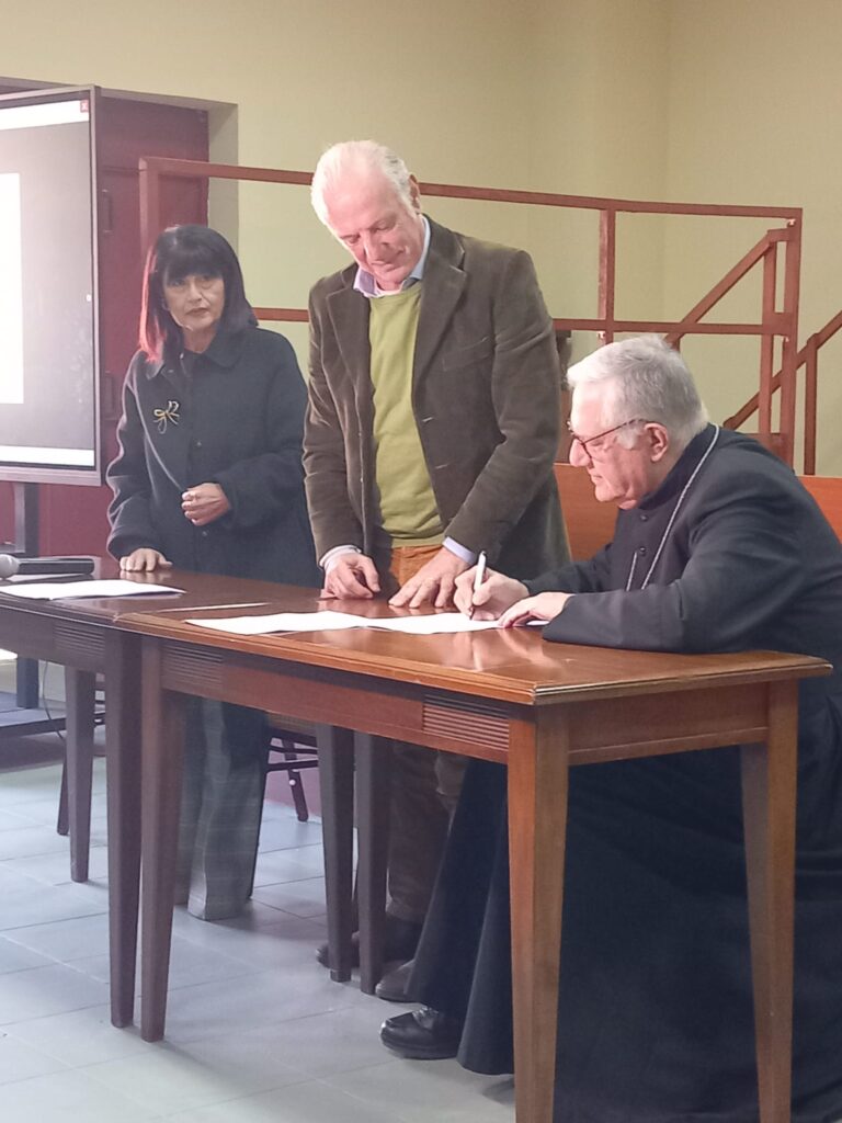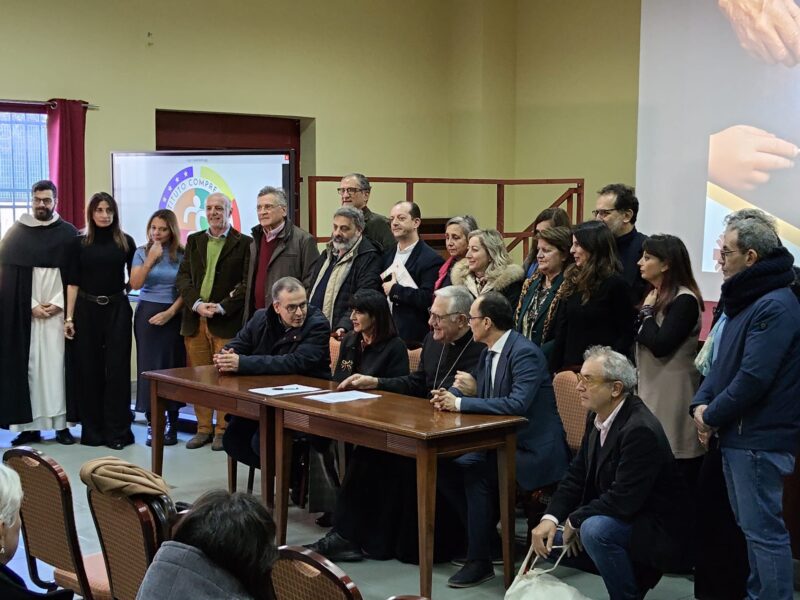 Primi firmatari S.E mons. Giovanni Accolla e S.E. il Prefetto dott.ssa Cosima Di Stani, una grande foto di gruppo con tutti i firmatari ha concluso i lavori della due giorni dedicati alla costruzione della comunità educante presso l’ Auditorium dell’ I.C. “Catalfamo” a Santa Lucia sopra Contesse.