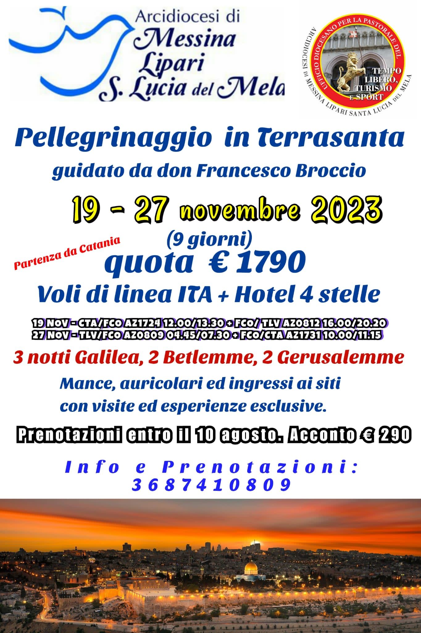L’ufficio diocesano di Pastorale del Turismo propone per tutta l’Arcidiocesi il Pellegrinaggio in Terrasanta e il Tour di Israele. Un’esperienza ricca di escursioni esclusive, alla ri-scoperta dei Luoghi Santi per un’esperienza unica, dalla durata di nove giorni. Il pellegrinaggio avrà inizio il 19 novembre 2023 e si concluderà il 27 novembre. Farà da guida Don Francesco Broccio, direttore dell’Ufficio per la pastorale del turismo e del tempo libero.