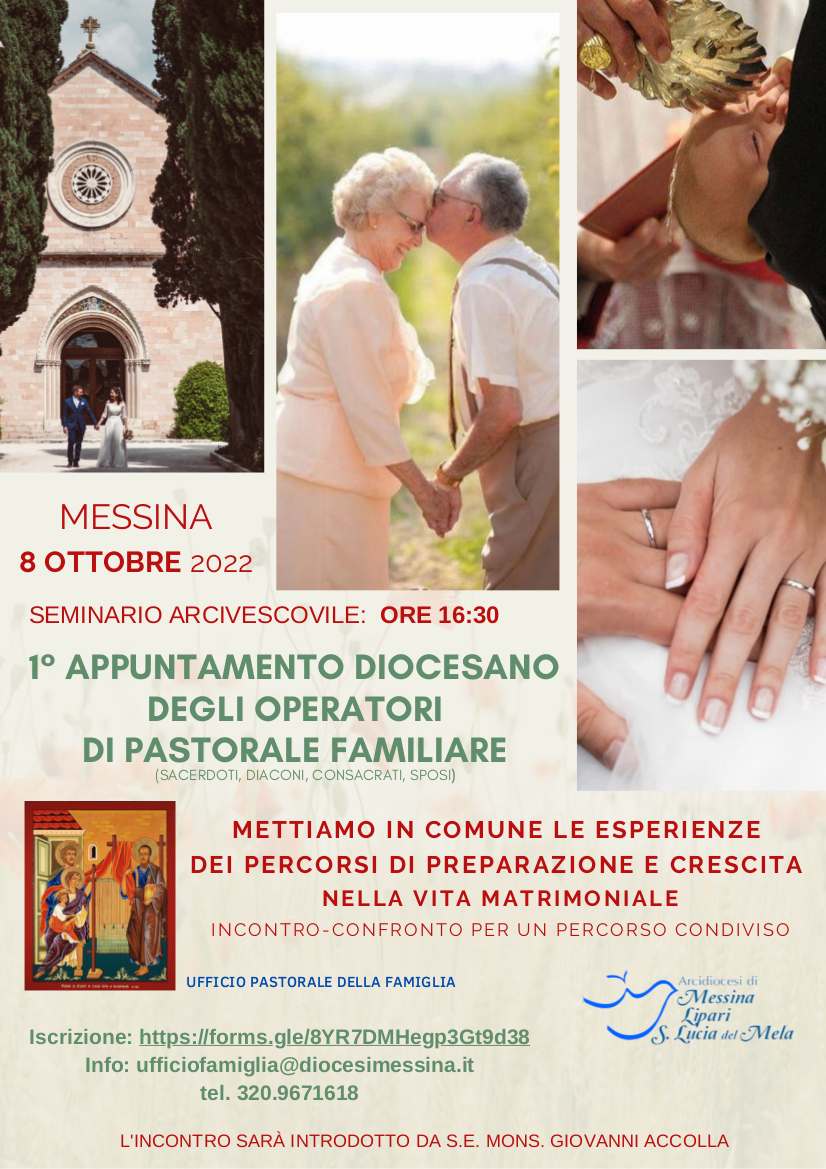 Sabato 8 ottobre gli operatori della pastorale delle famiglie sono invitate ad un primo incontro (vedi allegato) per condividere le esperienze, le difficoltà e le proposte dei cammini di preparazione alla celebrazione del sacramento del matrimonio e di quelli per l’accompagnamento delle coppie di sposi.