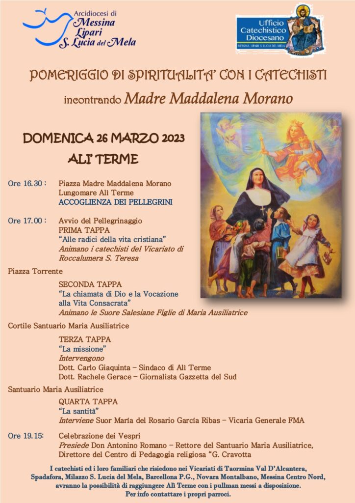 Il prossimo 26 Marzo nella ricorrenza dell’anniversario della nascita al cielo della Beata Maddalena Morano, Patrona dei Catechisti e degli Educatori della Arcidiocesi di Messina-Lipari-Santa Lucia del Mela, l’Ufficio Catechistico Diocesano, in collaborazione con l’Istituto Figlie di Maria Ausiliatrice di Alì Terme, organizzano un “Pomeriggio di Spiritualità” per riflettere sulla figura della Beata Morano, donna, madre e consacrata instancabile, esempio concreto di vita spesa per la catechesi e per l’evangelizzazione. Il ritrovo è alle ore 16.30 presso il lungomare di Alì Terme, Piazza Madre Morano. Si terminerà alle ore 19.15 con la preghiera del Vespro.