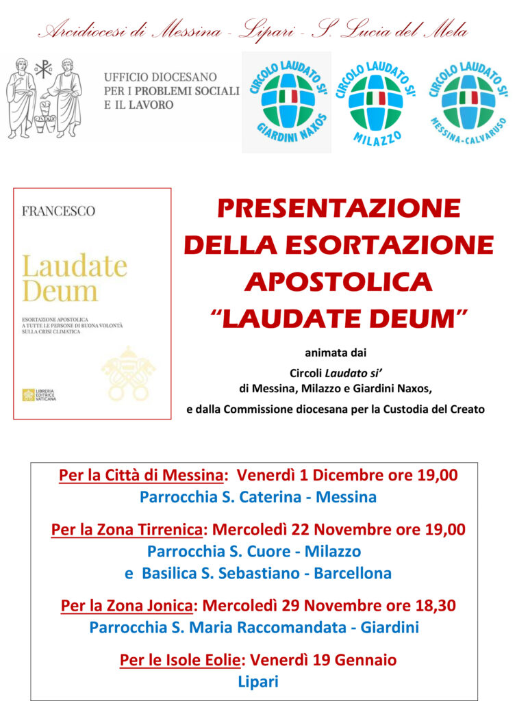L’Ufficio diocesano per i Problemi sociali e il Lavoro organizza nelle varie zone della nostra Arcidiocesi la presentazione dell’Esortazione Apostolica “Laudate Deum”. Gli incontri saranno animati dai Circoli Laudato si’ di Messina, Milazzo e Giardini Naxos, e dalla Commissione diocesana per la Custodia del Creato.