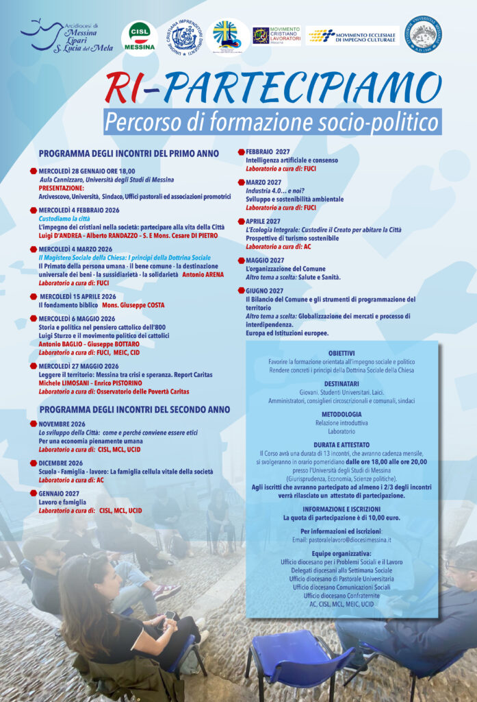 Il titolo RI-PARTECIPIAMO vuole essere un invito a riprendere l’entusiasmo per la partecipazione alla vita della Città. Sulla scia di un cammino pluridecennale l’Ufficio diocesano per i Problemi Sociali e il Lavoro insieme ai Delegati diocesani alla Settimana Sociale, all’Ufficio diocesano di Pastorale Universitaria, all’Ufficio diocesano Comunicazioni Sociali ed all’Ufficio diocesano Confraternite e con la collaborazione di alcune organizzazioni proponenti (AC, CISL, MCL, MEIC, UCID) vuole rilanciare l’importanza della formazione socio politica, come auspicato anche dal nostro Arcivescovo a conclusione della Visita Pastorale.