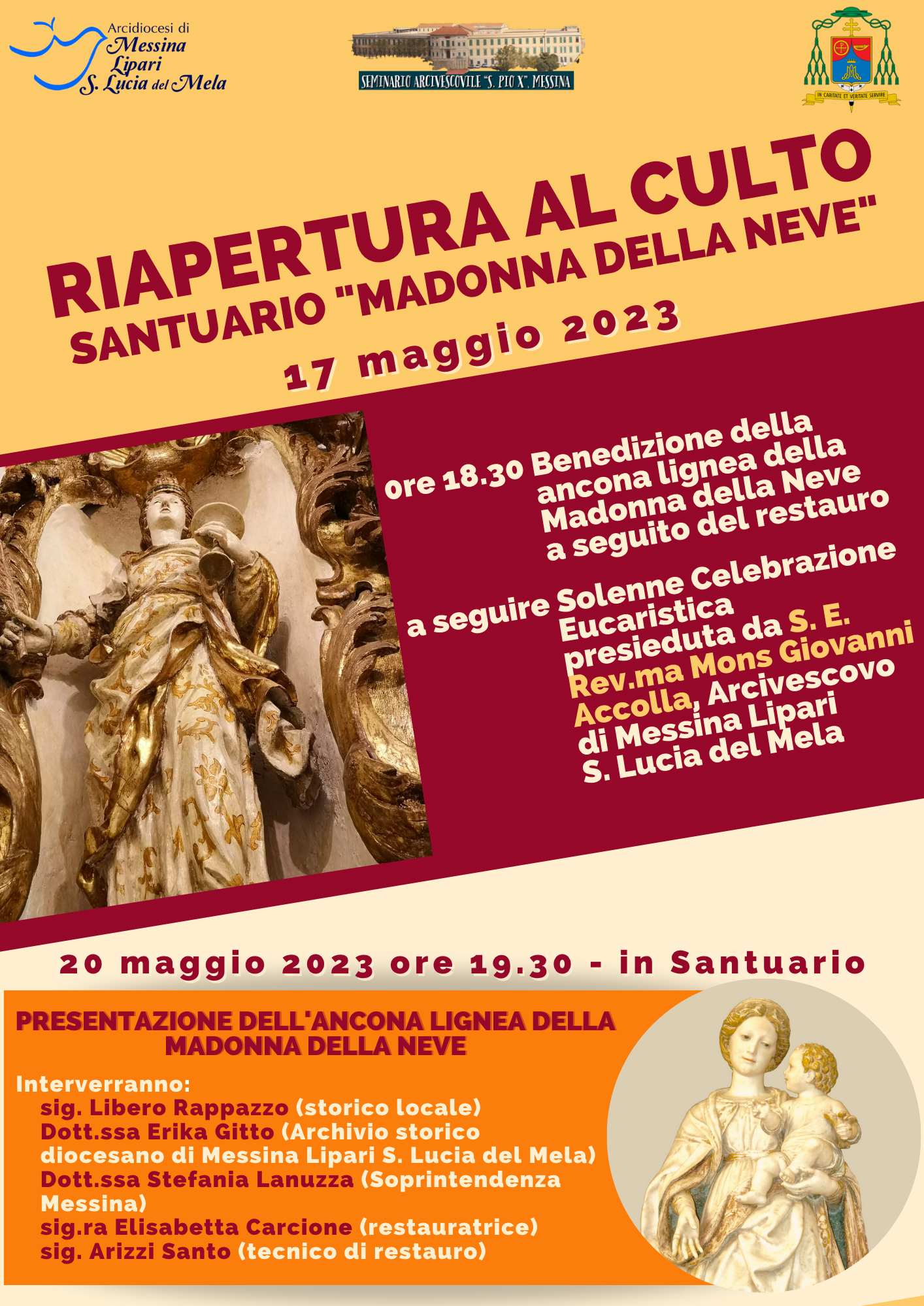 In seguito del restauro dell’Ancona Lignea dell’altare maggiore, il Santuario Madonna della Neve in S. Lucia del Mela riapre al culto il prossimo mercoledì 17 maggio alle ore 18.30. Presiederà la solenne Celebrazione Eucaristica il nostro Arcivescovo, S. E. Rev.ma Mons. Giovanni Accolla.