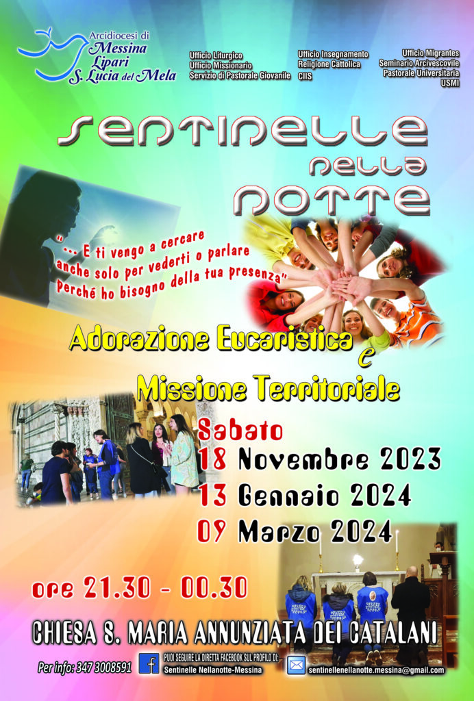 Dopo il periodo estivo, si avvia anche quest’anno, presso la chiesa “SS. Annunziata dei Catalani”, il Progetto Pastorale “Sentinelle nella notte” , che vede coinvolti alcuni Uffici e Organismi Diocesani (Ufficio Liturgico, Ufficio Migrantes, Ufficio Insegnamento Religione Cattolica, Ufficio Missionario, Servizio di Pastorale Giovanile, Pastorale Universitaria, Seminario Arcivescovile, USMI, CIIS), parrocchie, gruppi e movimenti, con l’obiettivo di donare ai giovani e ai meno giovani, frequentatori della “movida” messinese, l’opportunità di incontrare Gesù, mentre si è per strada. Il progetto prevede la realizzazione di 3 missioni territoriali dalle ore 21.30 alle ore 00.30 , nelle seguenti date: