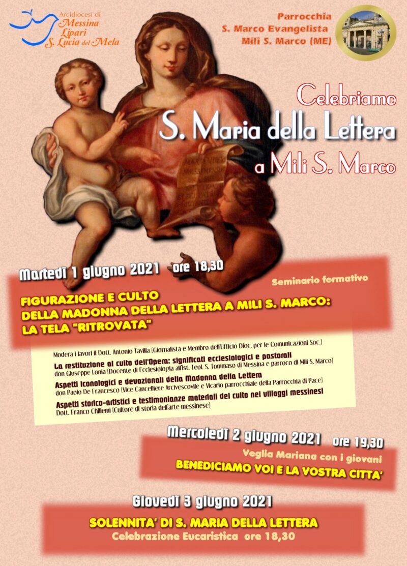 Figurazione e culto della Madonna della Lettera a Mili S. Marco: la Tela “ritrovata”. Sarà questo il tema che guiderà il Seminario formativo che, martedì 1 giugno, vedrà alternarsi, a partire dalle ore 18,30, don Giuseppe Lonia (Ecclesiologo e parroco di Mili S. Marco), don Paolo De Francesco (Vice Cancelliere Arcivescovile e Vicario Parrocchiale di Pace), Dott. Franco Chillemi (Cultore di storia dell’Arte Messinese). Modererà l’incontro il Dott. Antonio Tavilla (giornalista e membro dell’Ufficio Diocesano per le Comunicazioni Sociali). L’incontro è aperto a tutti, tenendo presente la capienza della Chiesa (100 posti) e le norme anticovid.