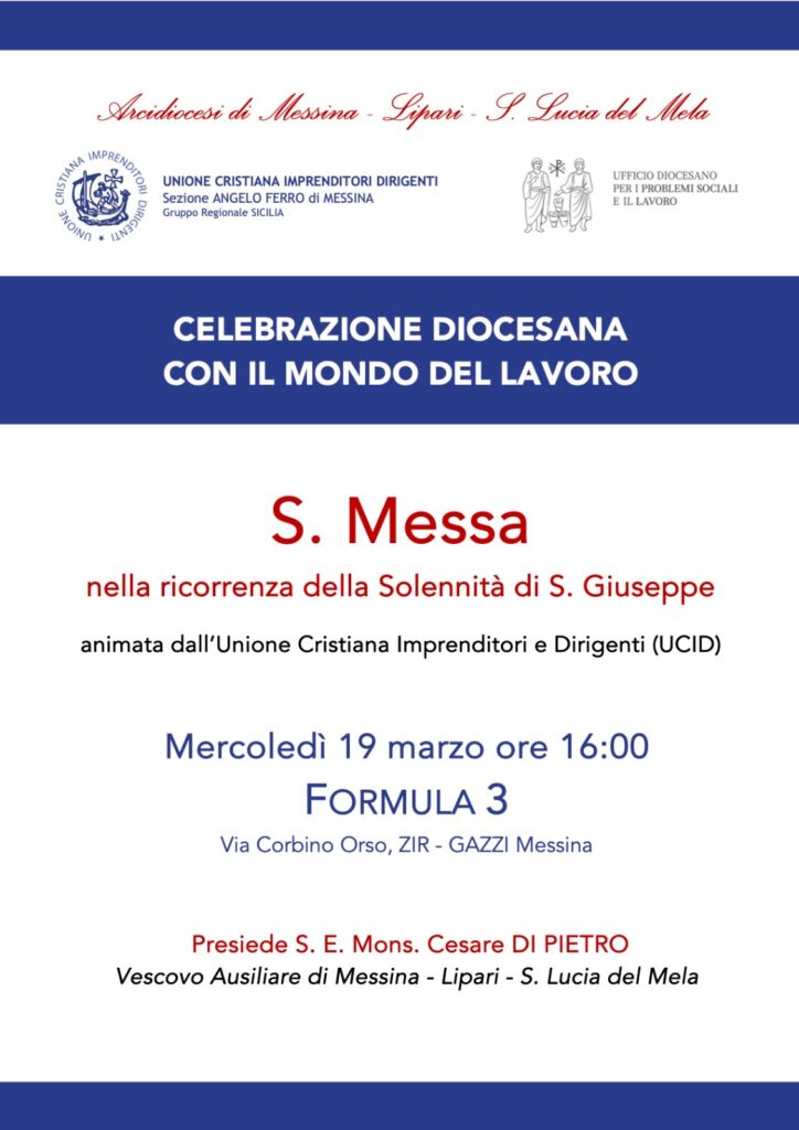 L’annuale celebrazione diocesana con i lavoratori e le lavoratrici, nella ricorrenza della Solennità di S. Giuseppe, si terrà mercoledì 19 marzo, alle ore 16.00, presso l’azienda Formula 3 (Via Corbino Orso, ZIR Messina), dove il Vescovo Ausiliare, Mons. Cesare DI PIETRO, presiederà la S. Messa con il mondo del lavoro.
