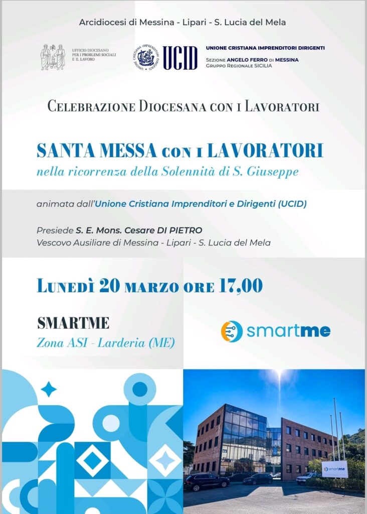L’Ufficio diocesano per i problemi sociali e il lavoro informa che l’annuale Celebrazione Eucaristica diocesana con i lavoratori, nella ricorrenza della Solennità di S. Giuseppe, si terrà lunedì 20 marzo, alle ore 17.00, presso l’Azienda SMARTME (ex Centro direzionale IRSAP), Zona Asi – Larderia (Me), dove il Vescovo Ausiliare, Mons. Cesare DI PIETRO, presiederà la S. Messa con il mondo del lavoro.