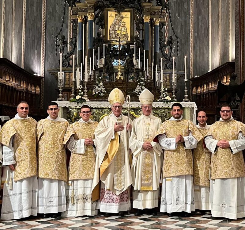 Stamattina, nella Basilica Cattedrale di Messina, per l’imposizione delle mani e la preghiera di ordinazione di S.E. Mons. Giovanni Accolla, Arcivescovo Metropolita, i Seminaristi Nicola Antonuccio, Rosario De Luca, Antonino Di Vincenzo, Antonino Morabito, Gianmarco Restuccia e Frà Mario Isgrò della Fraternità “Amici di Gesù Buon Pastore” sono stati ordinati diaconi, alla presenza del Vescovo Ausiliare Mons. Cesare Di Pietro, P. Maurizio Vaccaro, l’equipe formativa del Seminario Arcivescovile “S. Pio X” e dell’Almo Collegio Capranica, la comunità diaconale messinese, i presbiteri, le famiglie degli ordinandi e tanti fedeli dell’Arcidiocesi.