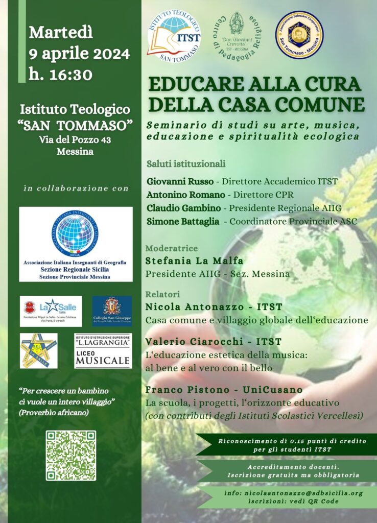 Martedì 9 aprile 2024, alle ore 16:30, presso l’Istituto Teologico San Tommaso di Messina, si svolgerà l’annuale Seminario di Pedagogia che quest’anno pone la sua attenzione sui temi della cura della casa comune. Promotori dell’iniziativa, oltre all’Istituto Teologico (ITST), il Centro di Pedagogia Religiosa “Don Giovanni Cravotta” (CPR) e il Centro Locale dell’Associazione dei Salesiani Cooperatori (ASC).
