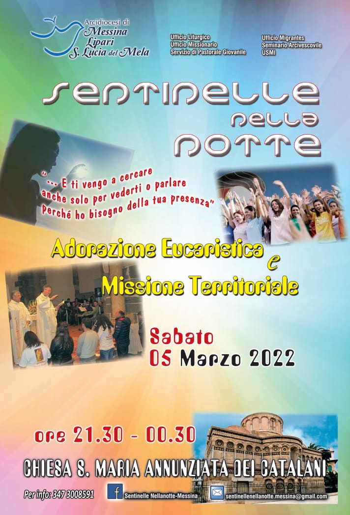 Nell’ambito del progetto pastorale “Sentinelle nella notte”, sabato 5 marzo, dalle ore 21.30 alle ore 00.30, presso la chiesa “SS. Annunziata dei Catalani”, alcuni Uffici e organismi diocesani (Ufficio Liturgico, Ufficio Migrantes, Ufficio Missionario, Pastorale Giovanile Diocesana, Seminario Arcivescovile, Usmi) proporranno un’esperienza di Adorazione Eucaristica e missione territoriale rivolta soprattutto ai giovani della nostra città. Presiederà l’Adorazione comunitaria delle ore 21.30 il Direttore della Pastorale Giovanile Diocesana, padre Stefano Messina.