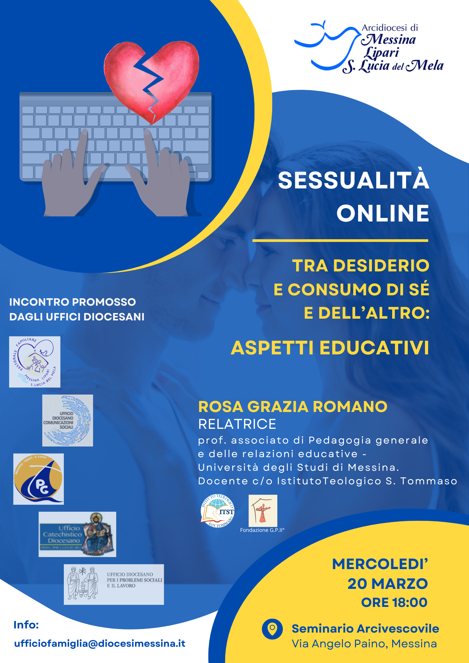 Si terrà mercoledì 20 marzo alle ore 18:00 presso il seminario arcivescovile di Messina l’incontro di formazione promosso da diversi uffici diocesani nell’ambito del corso “Corporeità e Crescita Spirituale” per gli operatori della pastorale familiare (vedi allegato).