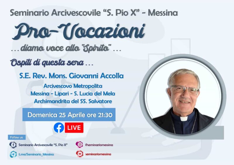 Stasera, Domenica 25 Aprile, domenica del “Buon Pastore”, ospite d’eccezione sarà il nostro Arcivescovo S. E. Mons. Giovanni Accolla, intervistato in diretta streaming alle ore 21.30. L’Arcivescovo condividerà la Sua testimonianza vocazionale e risponderà alle domande dei seminaristi e di quanti seguiranno l’evento, che potrà essere seguito sia sulla pagina facebook del Seminario Arcivescovile “S. Pio X” che su quella dell’Arcidiocesi.