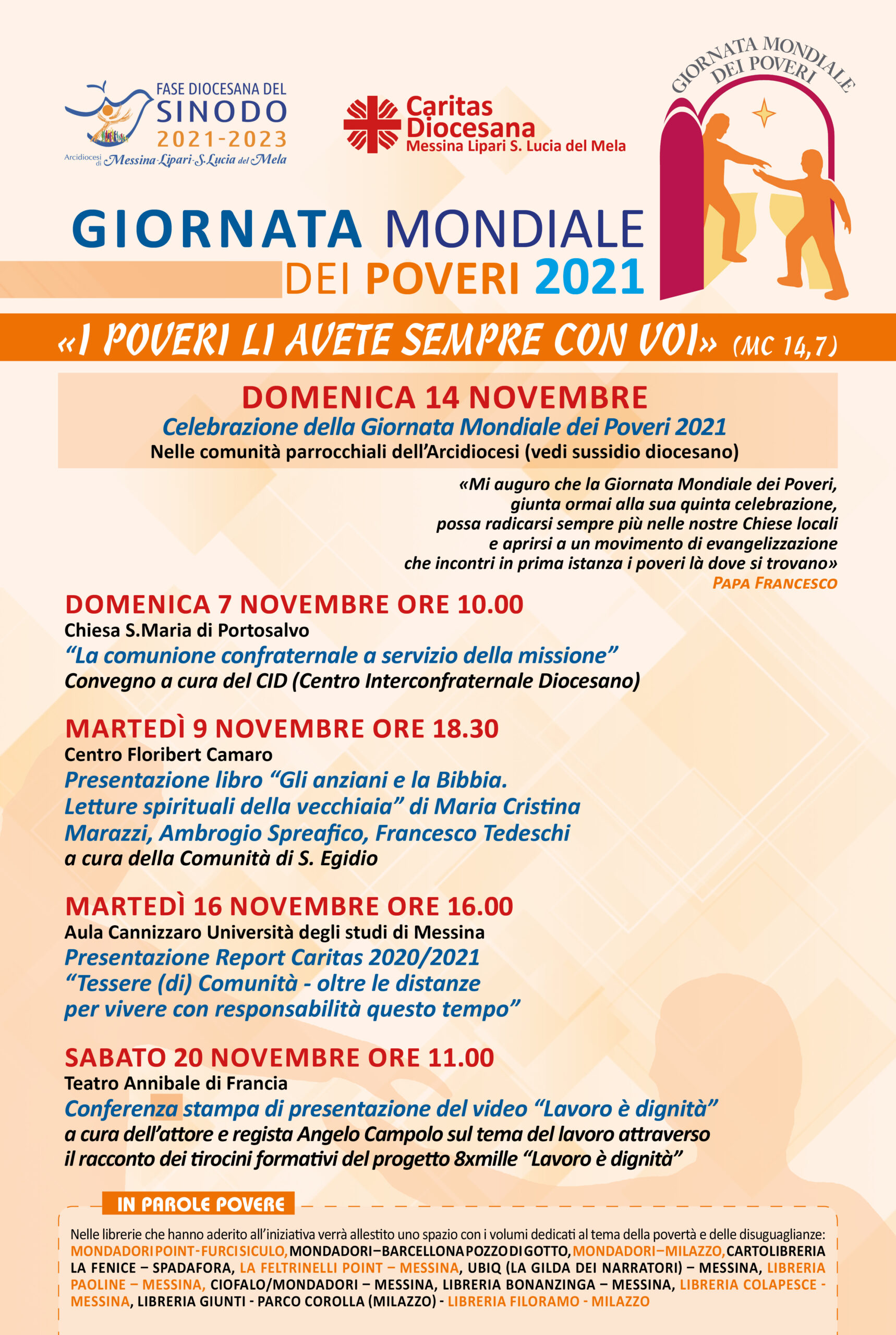 «L’istituzione della Giornata Mondiale dei Poveri, da parte di Papa Francesco, a conclusione del Giubileo Straordinario della Misericordia (8 dicembre 2015 – 20 novembre 2016), non rappresenta una mera novità in ambito ecclesiale. Essa è, piuttosto, l’eco del rapporto epocale – così forte da poterlo quasi definire “sacramentale” – tra la Chiesa e i poveri, già presente dalle origini dell’annuncio evangelico» (S.E. Mons. Giovanni Accolla)