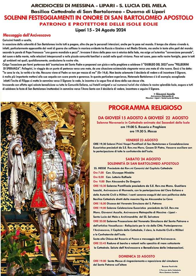 L’arcidiocesi celebra la solennità dell’apostolo Bartolomeo, patrono della Chiesa di Messina Lipari S. Lucia del Mela e protettore delle Isole Eolie.