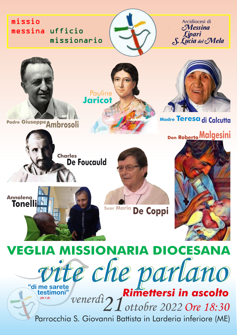 La Veglia Missionaria Diocesana, presieduta dal Vescovo Ausiliare Mons. Cesare Di Pietro, sarà celebrata Venerdì 21 ottobre alle ore 18,30 nella Parrocchia S. Giovanni Battista in Larderia Inferiore.