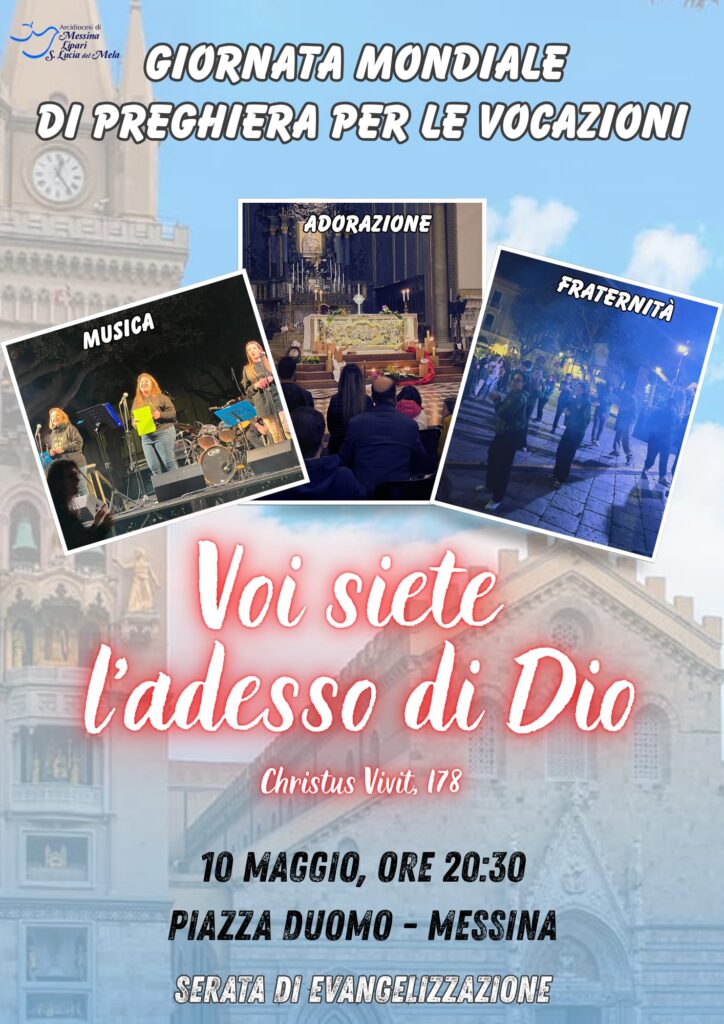 Anche quest’anno, in occasione della Giornata Mondiale di Preghiera per le Vocazioni, la sera del 10 Maggio diversi giovani della nostra diocesi di Messina, insieme ad i seminaristi diocesani ed i giovani in formazione delle comunità religiose del territorio scenderanno in piazza duomo per diffondere la gioia di aver incontrato Cristo. Il tema sarà “Voi siete l’adesso di Dio” (Christus Vivit, 178). Oltre le cellule di evangelizzazione che gireranno per incontrare i ragazzi della movida, vi sarà allestito un palco in piazza duomo che allieterà la serata con buon musica ed esibizioni dei piccoli e dei giovani di diversi gruppi. Chi poi vorrà fermarsi in preghiera e magari approfittare del Sacramento della Riconciliazione troverà il duomo aperto con Gesù Eucaristia esposto e i sacerdoti disponibili per le confessioni. Vi aspettiamo numerosi a partire dalle ore 20.00 di sabato 10 Maggio.