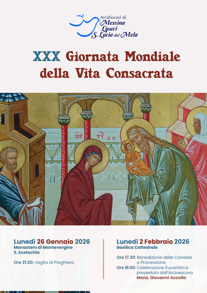 Questo il Programma della nostra Chiesa locale: Lunedì 26 gennaio alle 21 presso il Monastero di Montevergine a S. Eustochia Veglia di Preghiera in preparazione alla Giornata; Lunedì 2 febbraio alle 17,30 nella Basilica Cattedrale S. Maria Assunta Benedizione delle Candele in Piazza Immacolata di Marmo, Processione verso la Cattedrale e Celebrazione Eucaristica presieduta dall’Arcivescovo Mons. Giovanni Accolla. Invitati le Consacrate e i Consacrati delle Comunità presenti in Diocesi, insieme ai Fedeli, Giovani e Famiglie delle Parrocchie e dei Santuari ed alle Associazioni laicali, Terzordini e Confraternite collegate agli Istituti di Vita Consacrata.